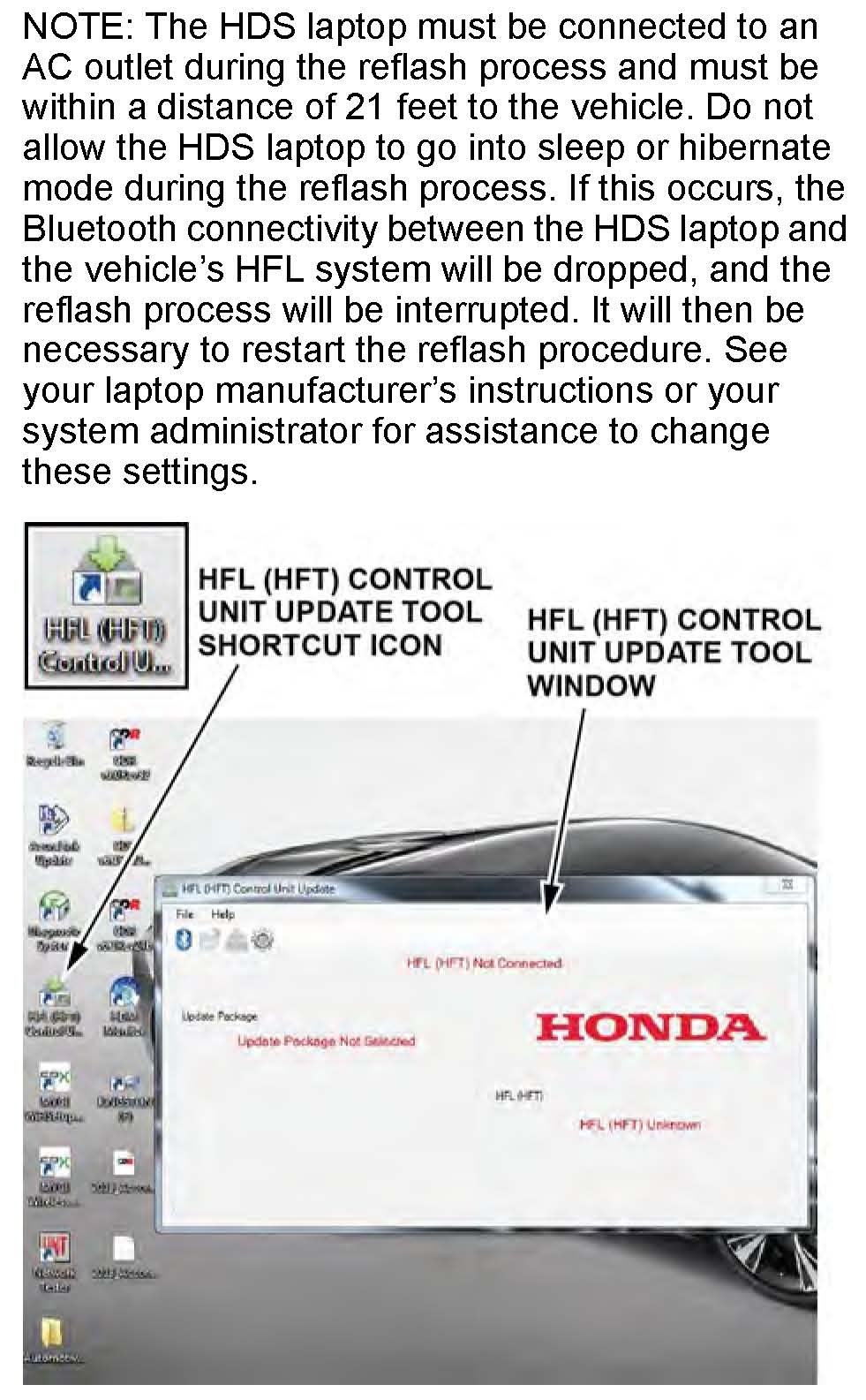6. On the HDS laptop, double-click the HFL Control Unit Update icon to launch the Honda HFL (HFT) Control Unit Update Tool (HFL update tool).