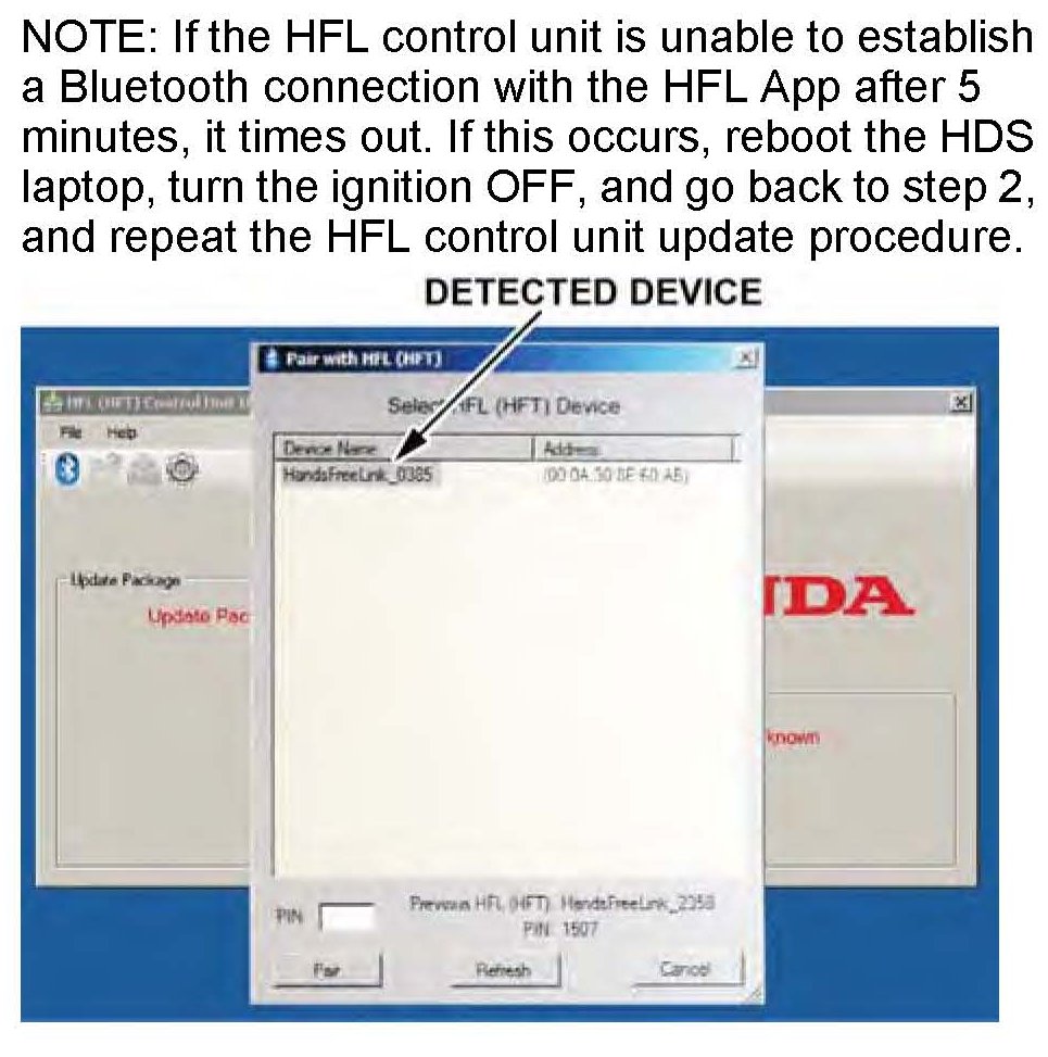 25. In the HFL update tool, the "Pair with HFL" window pops up. Wait a moment while Bluetooth devices are detected. If no devices are found after 30 seconds or so, click Refresh.