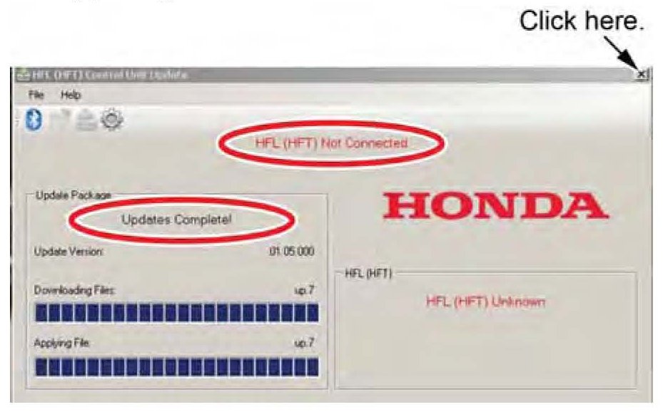 18. The HDS laptop will indicate the update is complete, and automatically disconnects the Bluetooth connection from the HFL control unit. Close the HFL update tool by clicking on the "X" in the upper right-hand corner.