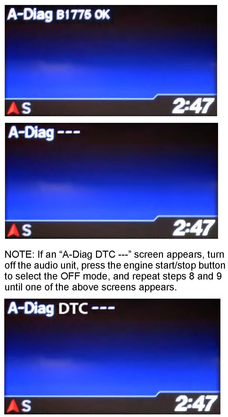 10. Press and hold the PHONE button for at least 5 seconds to enter the HFL diagnostic mode. One of the following screens appears: "A-Diag XXXXX OK" or "A-Diag ---."