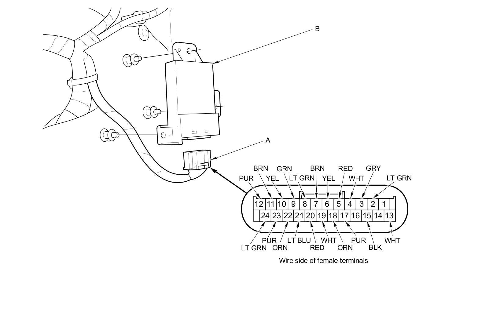 3. Disconnect the 24P connector (A) from the power mirror control unit (B).