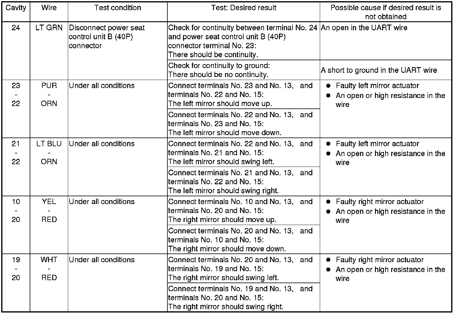 5. Reconnect the connector to the power mirror control unit, and do the following input tests: