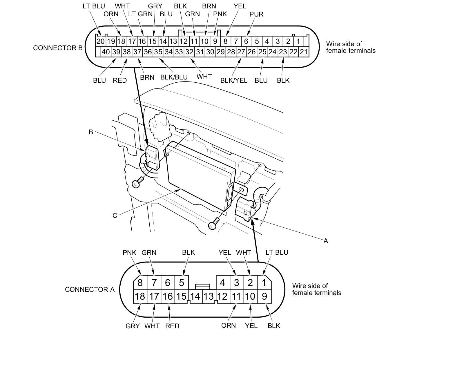 3. Disconnect the 18P connector (A) and 40P connector (B) from the power seat control unit (C).