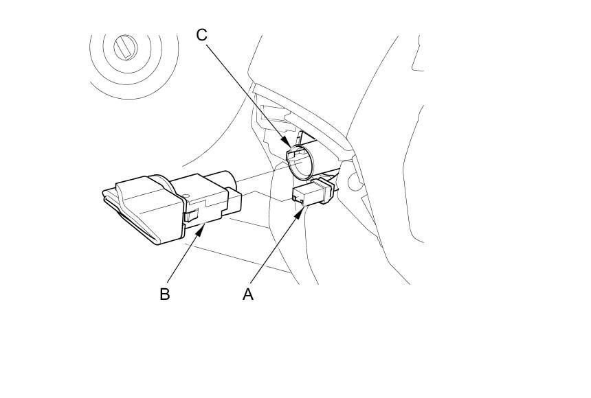 2. Disconnect the connector (A), and remove the humidity/in-car temperature sensor (B) from the aspirator hose (C).