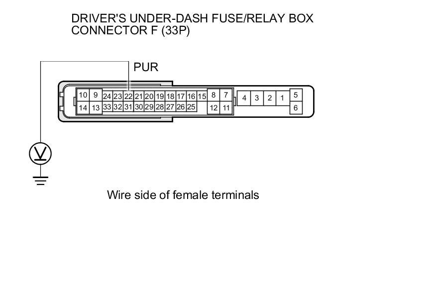 8. Measure the voltage between driver's under-dash fuse/relay box connector F (33P) terminal No. 22 and body ground.