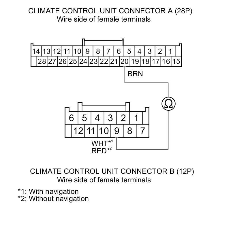13. Check for continuity between climate control unit connector A (28P) terminal No. 20 and evaporator temperature sensor 2P connector terminal No. 1.