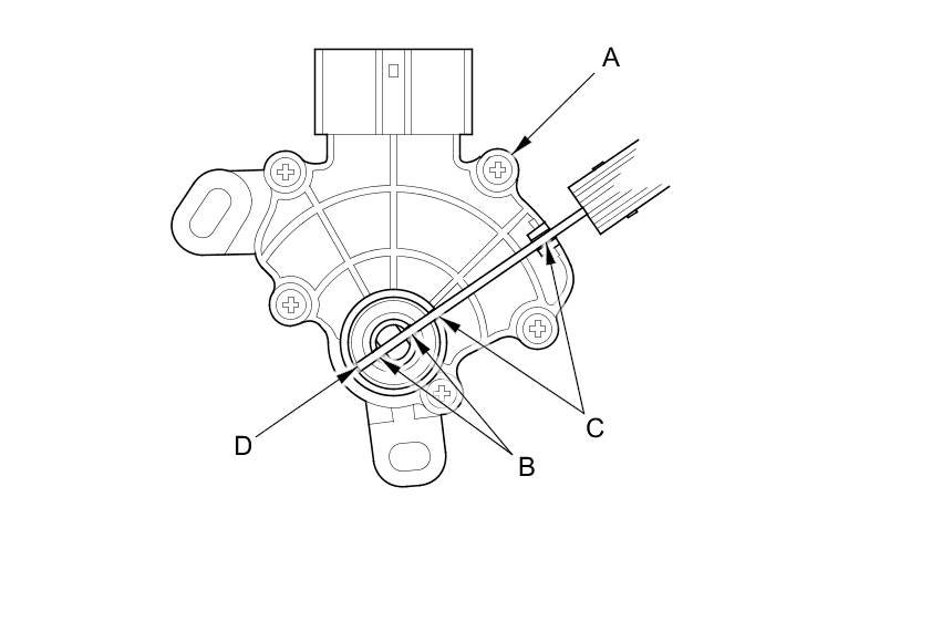 8. Set the transmission range switch (A) to the N position. Align the cutouts (B) on the rotary-frame with the neutral positioning cutouts (C) on the transmission range switch. Then put a 2.0 mm (0.079 in) feeler gauge blade (D) in the cutouts to hold the transmission range switch in the N position.