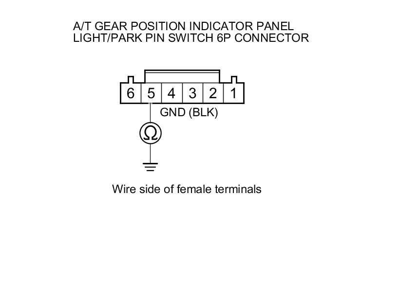 18. Check for continuity between A/T gear position indicator panel light/park pin switch 6P connector terminal No. 5 and body ground.