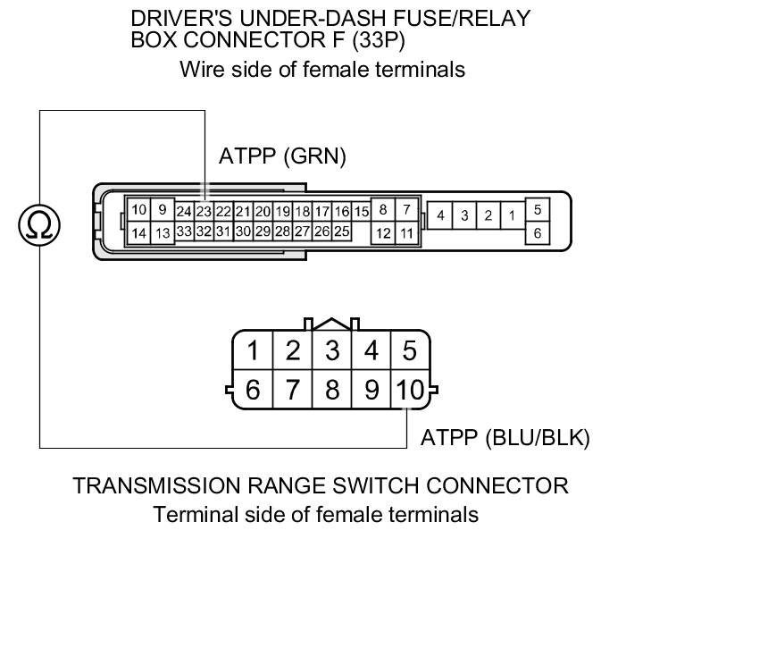22. Check for continuity between driver's under-dash fuse/relay box connector F (33P) terminal No. 23 and transmission range switch connector terminal No. 10.