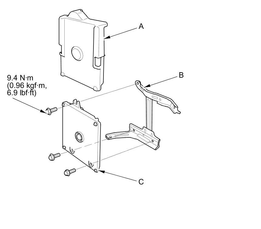 12. Remove the cover (A) and the bracket (B) from the PCM (C).