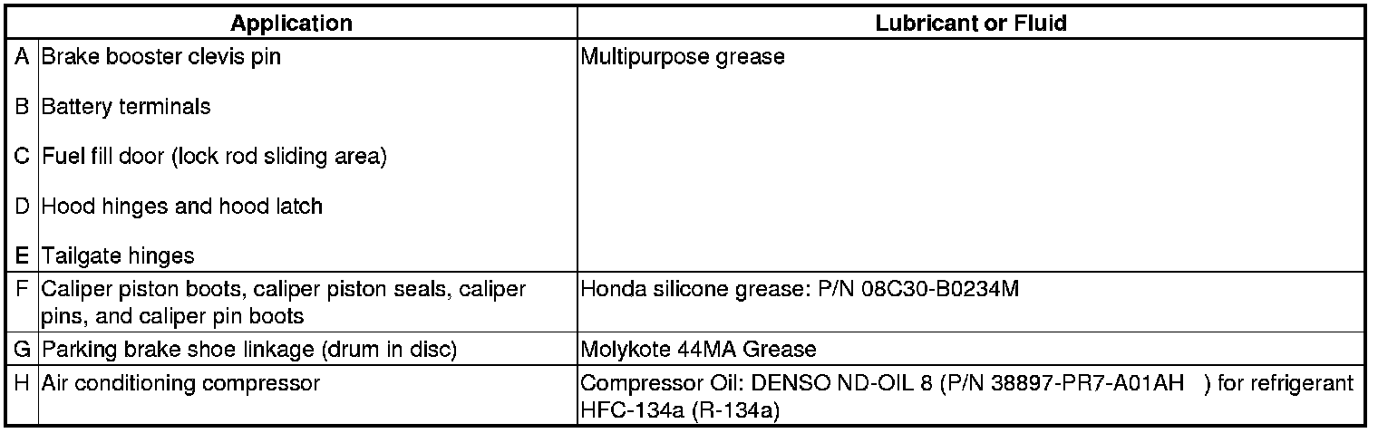 - Lubricate the following areas using the recommended lubricants and fluids.