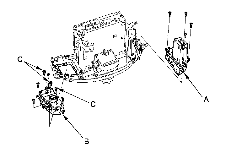 2. Remove the self-tapping screws and the driver's climate control switch (A), and the passenger's climate control switch (B). If necessary, replace the bulb (C).