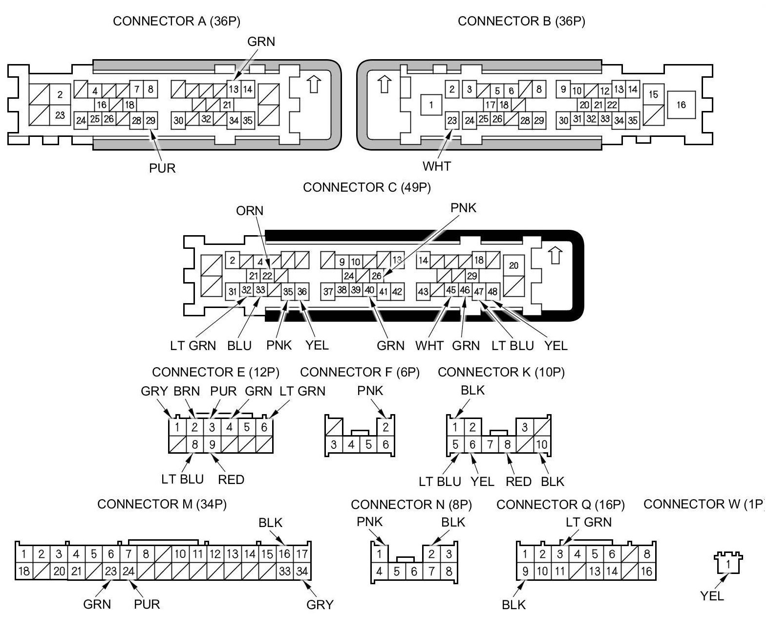 NOTE: All connector views are shown from wire side of female terminals.