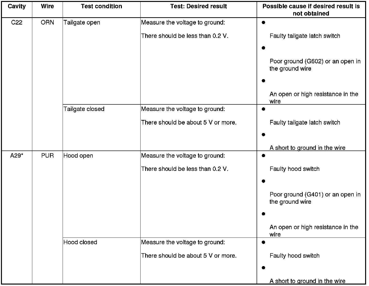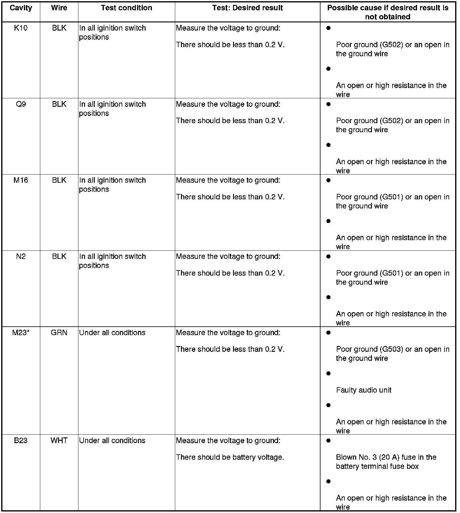 6. Reconnect the connectors to the under-dash fuse/relay box, and do these input tests at the following connectors.