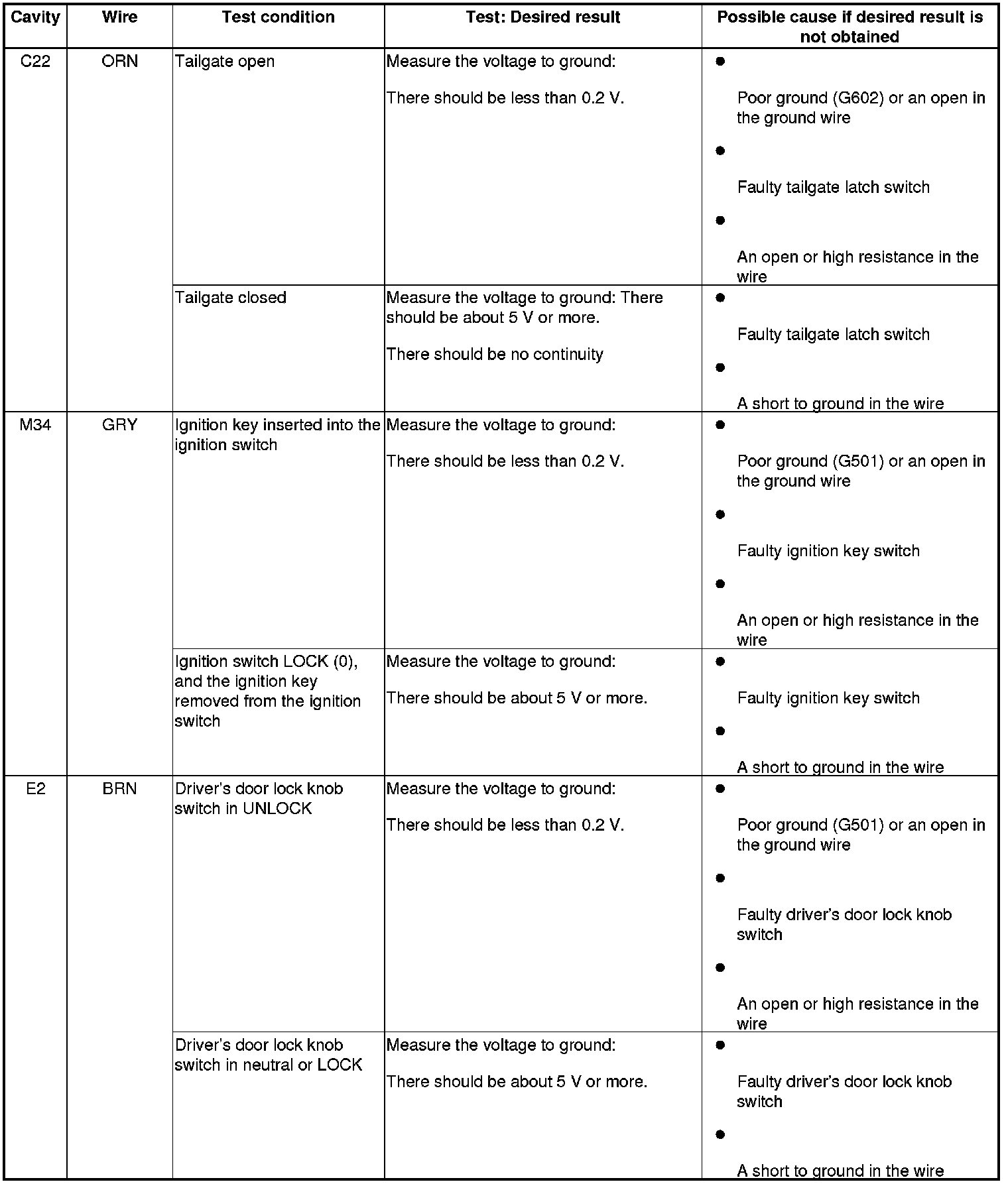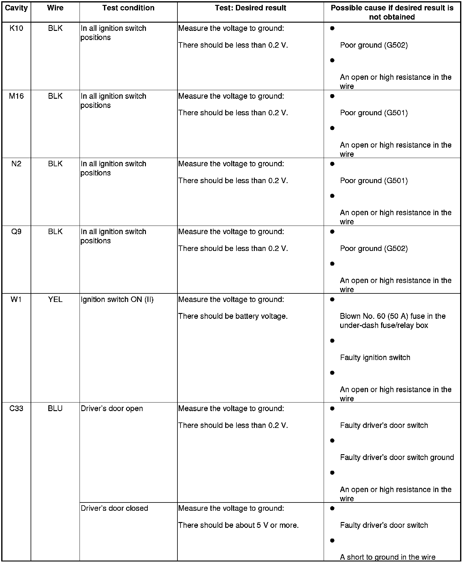 5. Reconnect the connectors to the under-dash fuse/relay box, and do these input tests at the following connectors.