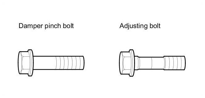 - The camber angle can be adjusted up to ±20 ' (center of tolerance) by replacing one damper pinch bolt with the adjusting bolt.