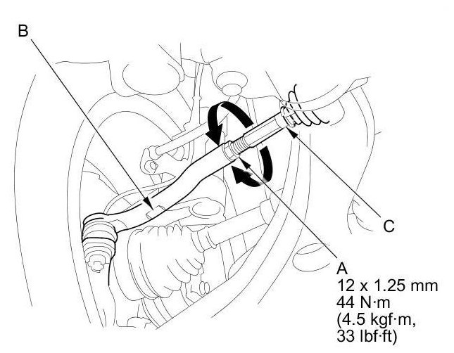 3. Loosen the tie-rod locknuts (A) while holding the flat surface sections (B) of the tie-rod end with a wrench, and turn both tie-rods (C) until the front toe is within specifications.
