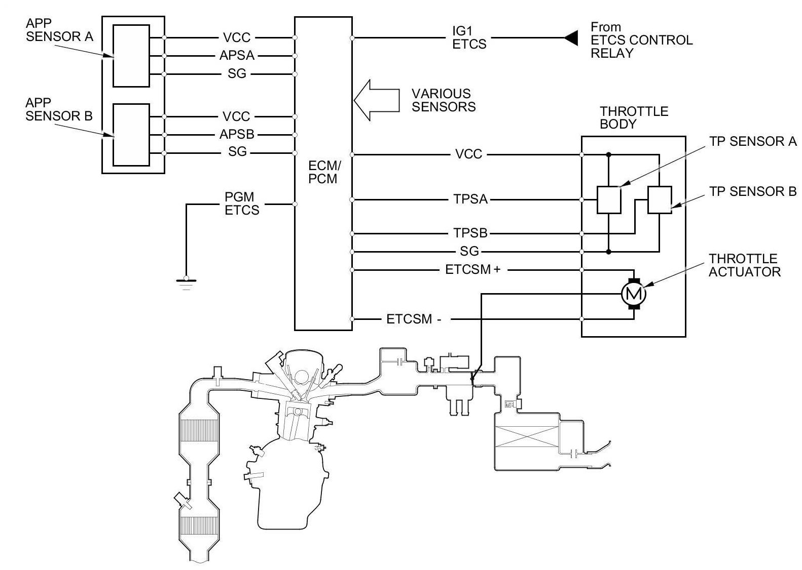 The electronic throttle control system consists of the throttle actuator, TP sensor A/B, the APP sensor A/B, the ETCS control relay, and the ECM/PCM.