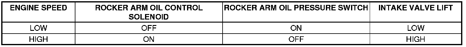 At low engine speed, the rocker arm oil control solenoid is turned off by the ECM/PCM. Oil pressure from the rocker arm oil control valve does not enter the intake rocker shaft. Both intake rocker arms are lifted by the low lift cam lobe.