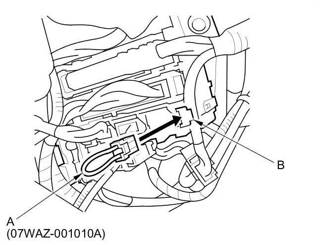 4. Connect the MPCS service connector (A) to the multiplex control inspection connector socket (B) in the under-dash fuse/relay box.