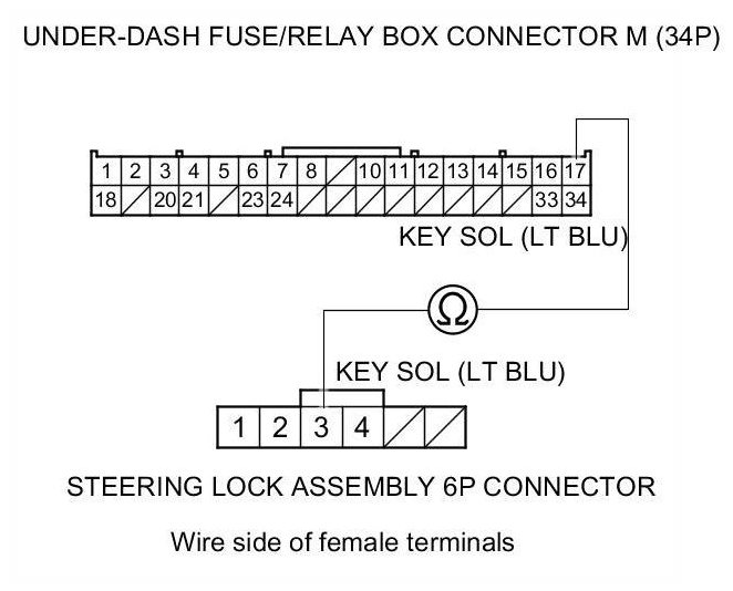 11. Check for continuity between under-dash fuse/relay box connector M (34P) terminal No. 17 and steering lock 6P connector terminal No. 3.