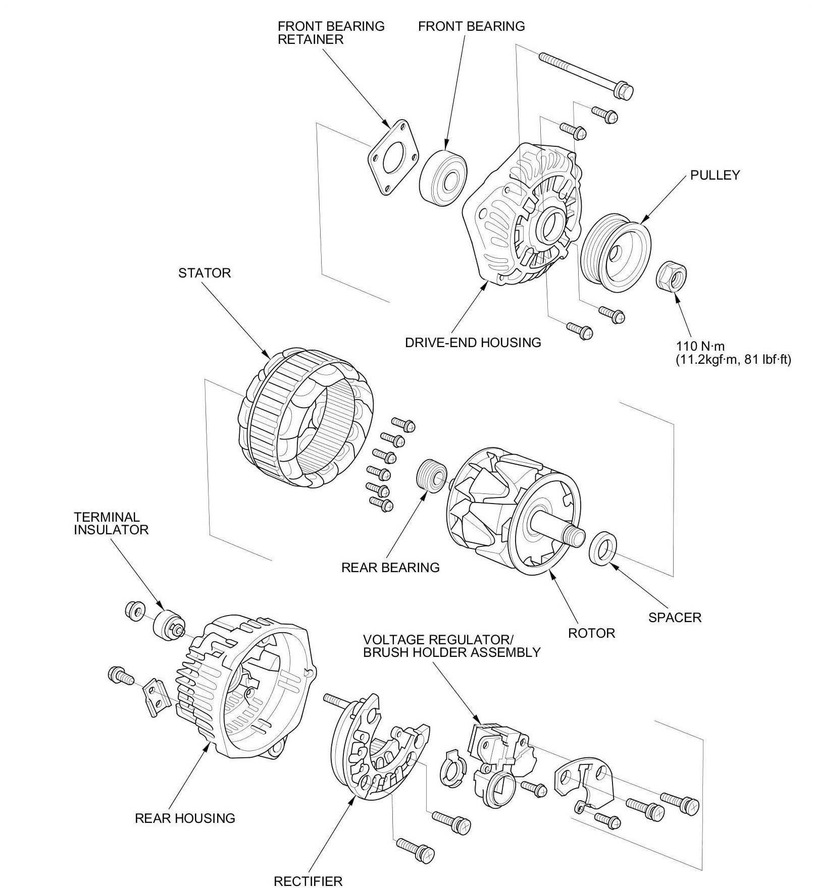 25. If you removed the pulley, put the rotor in the drive-end housing, then torque its locknut to 110 Nm (11.2 kg-m, 81 lb-ft).