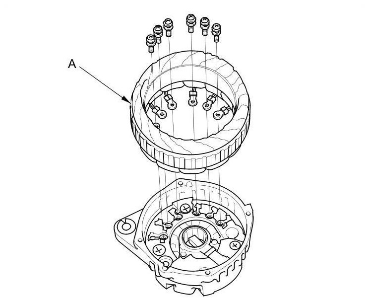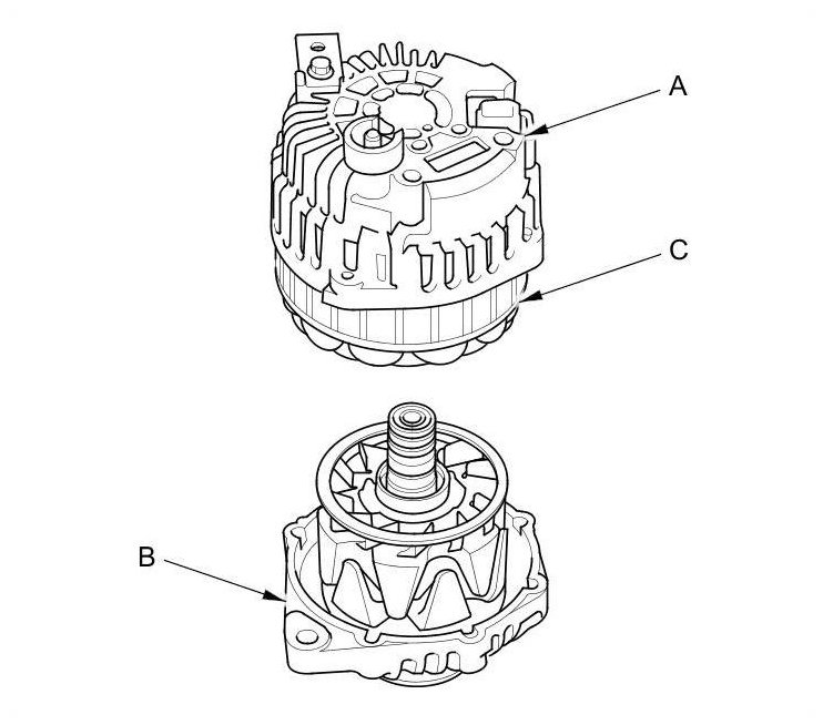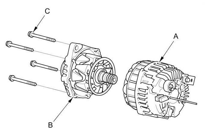 6. Separate the rear housing (A) and the drive-end housing (B) with the stator (C) attached to the rear housing.
