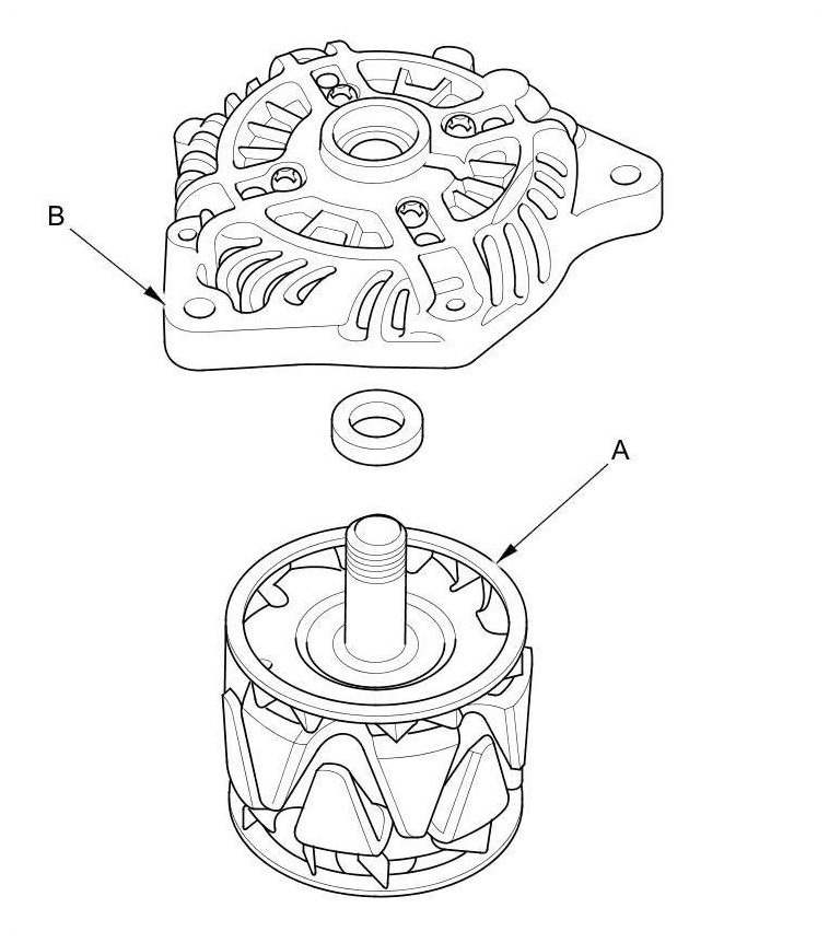 9. Inspect the rotor shaft for scoring, and inspect the bearing journal surface in the drive-end housing (B) for seizure marks:
