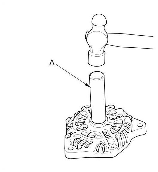 14. Install a new front bearing in the drive-end housing with a hammer, the driver handle, 15 x 135L (A), and the bearing driver attachment, 42 x 47 mm (B).