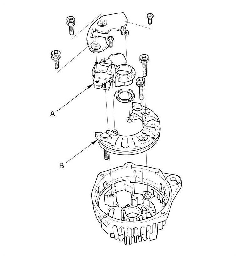 17. Remove the voltage regulator/brush holder assembly (A) and the rectifier (B).