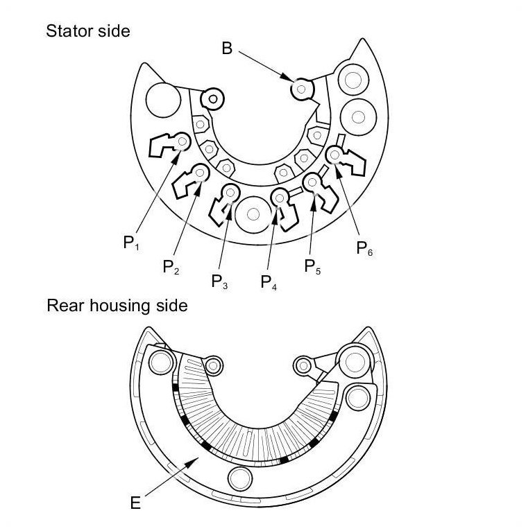 18. Check for continuity in each direction, between the B terminal and P terminals, and between the E terminal and P terminals of each diode pair. All diodes should have continuity in only one direction. Because the rectifier diodes are designed to allow current to pass in one direction, and the rectifier is made up of six diodes (six pairs), you must test each diode in both directions for continuity with an ohmmeter that has diode checking capability: a total of 24 checks: