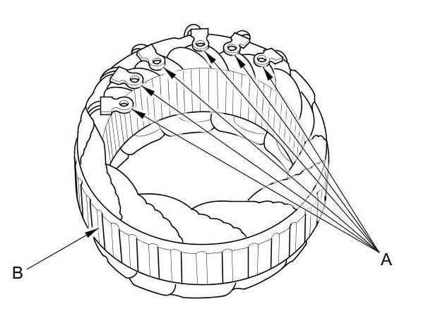 22. Check for continuity between each slip ring and the rotor (B) and the rotor shaft (C):
