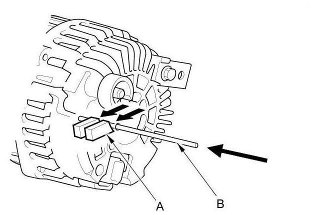 29. Push the brushes (A) in, then insert a pin or drill bit (B) (about 1.8 mm (5/64 in) diameter) to hold them there.