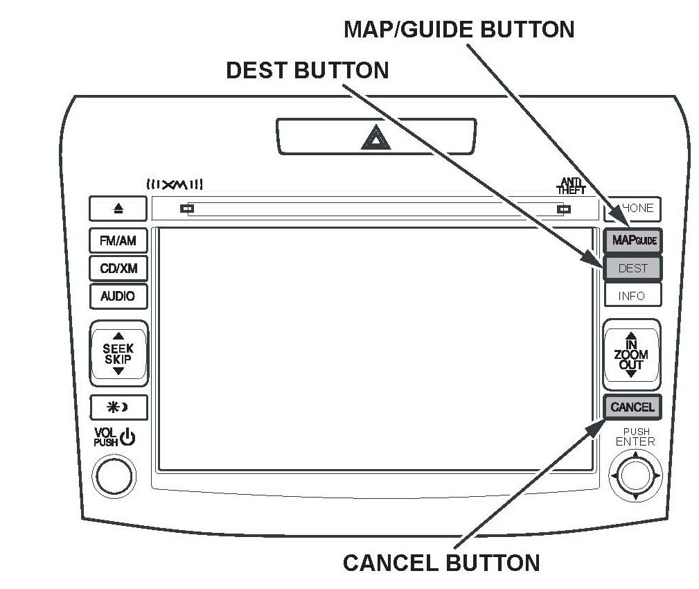 3. Wait for the navigation system to boot up. When the disclaimer screen appears, press and hold the MAP/GUIDE, the DEST, and the CANCEL buttons for at least 5 seconds until the Select Diagnosis Items screen appears.