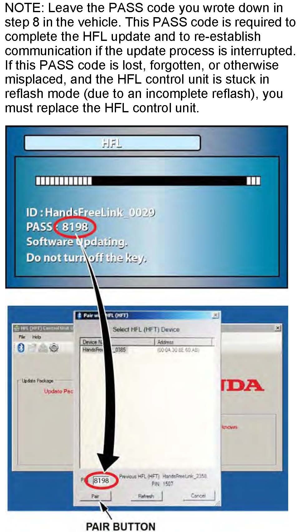 8. The HFT software update screen displays a 4-digit PASS code. Write it down on a piece of paper or on the RO and leave it in the vehicle.