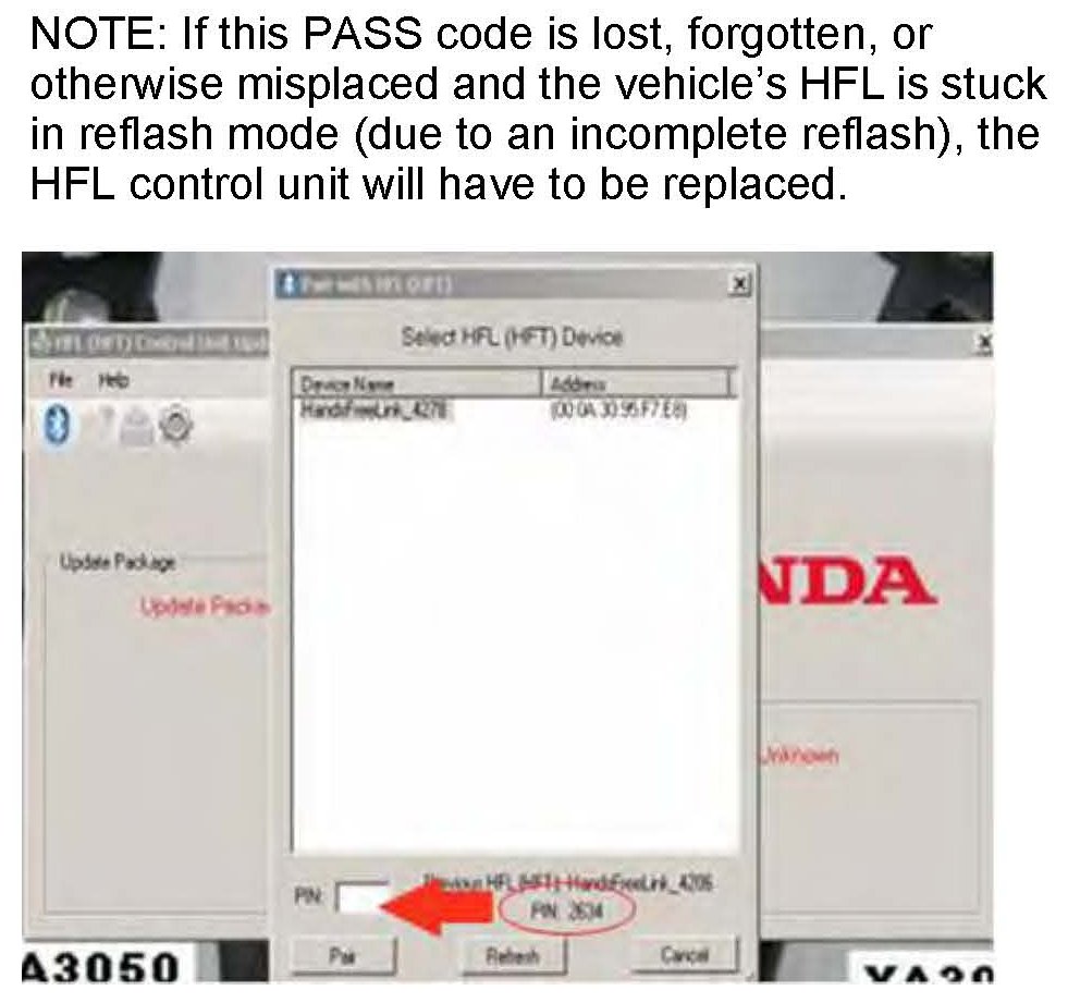 26. In the HFL update tool, once the Bluetooth device has been detected, enter the four-digit PASS code you wrote down in HFL CONTROL UNIT UPDATE PROCEDURE - CR-V, Vehicles with Navigation, step 8, into the lower left-hand corner of the pop-up window. Click Pair to begin the pairing process.