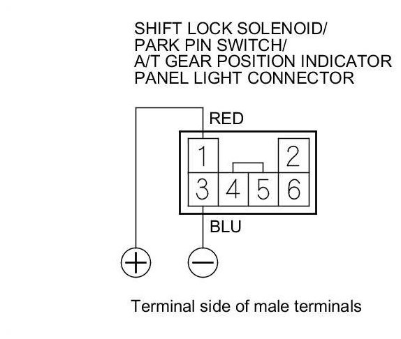 NOTE: Do not connect the positive battery terminal to the connector terminal No. 3 or you will damage the diode inside the shift lock solenoid.
