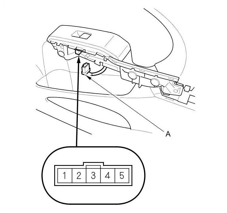 2. Disconnect the 5P connector (A) from the passenger's window switch.