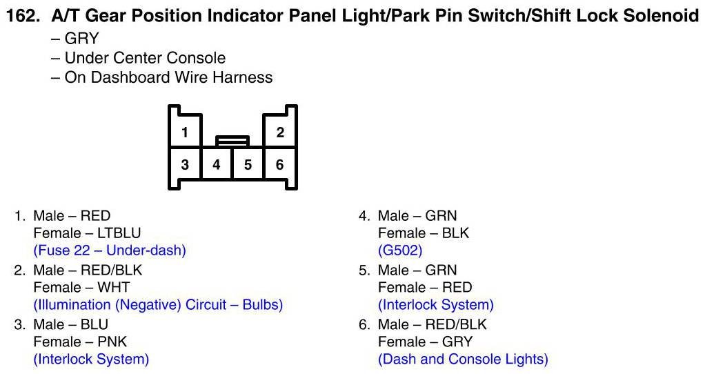 View 162 - A/T Gear Position Indicator Panel Light/Park Pin Switch/Shift Lock Solenoid Connector View