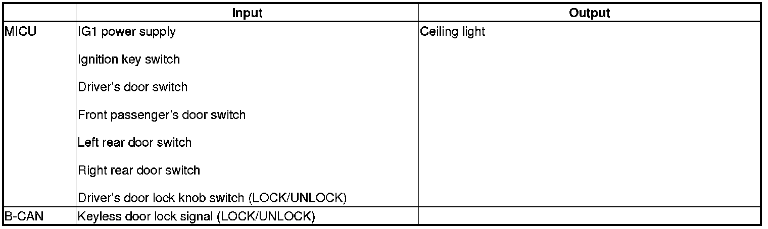 The MICU controls the ceiling light ON/OFF based on inputs signals from each switch.