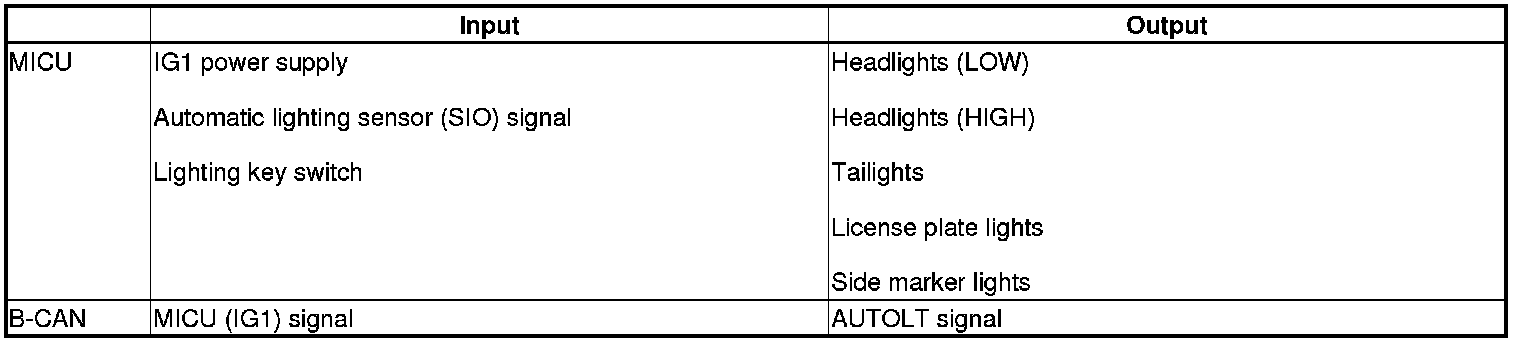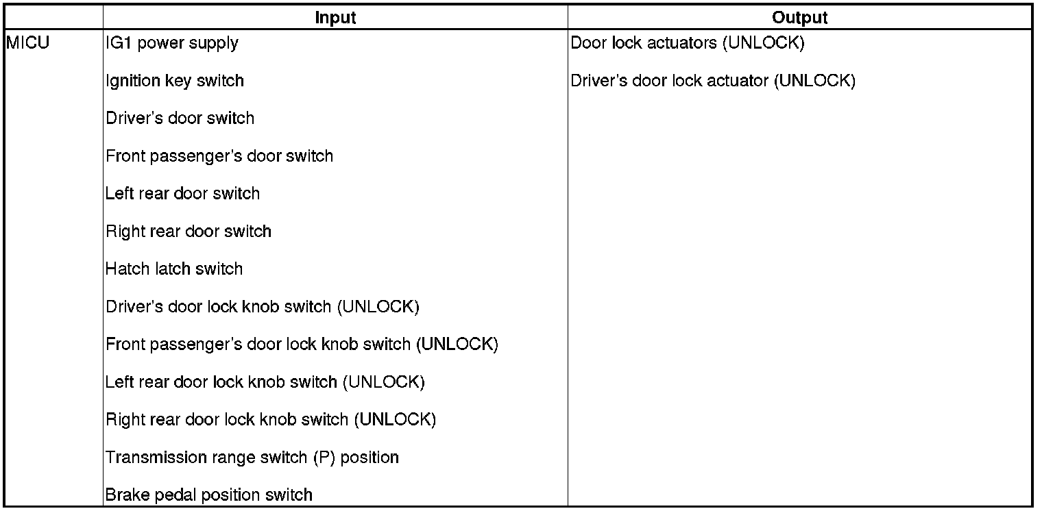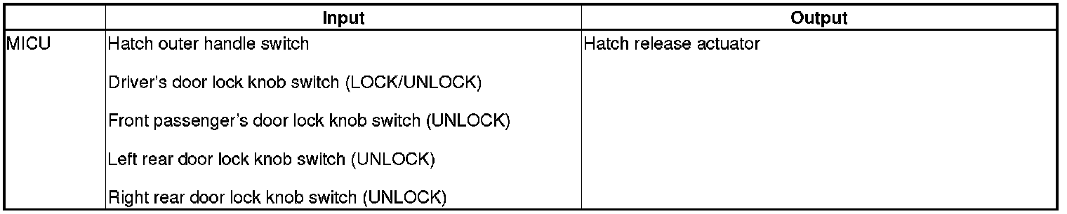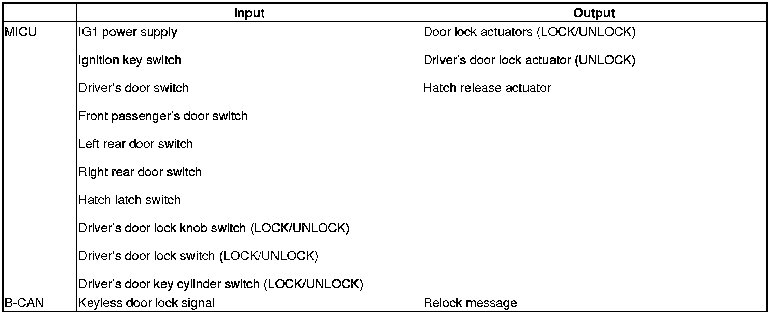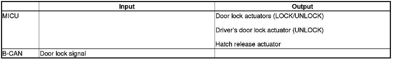 The MICU controls the door lock actuators LOCK, UNLOCK, DRIVER'S UNLOCK, HATCH UNLOCK based on B-CAN door lock switch signals.