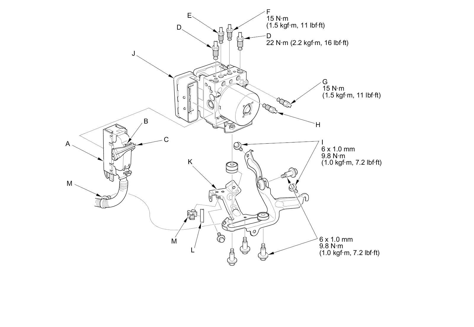 4. Remove the 6 x 16 mm flange bolt (I), then remove the VSA modulator-control unit (J) with the bracket (K) from the body.