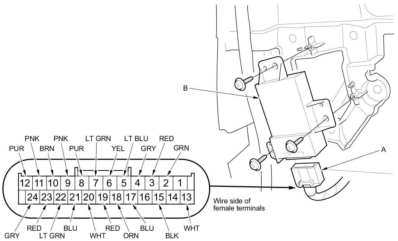 3. Disconnect the 24P connector (A) from the power mirror control unit (B).