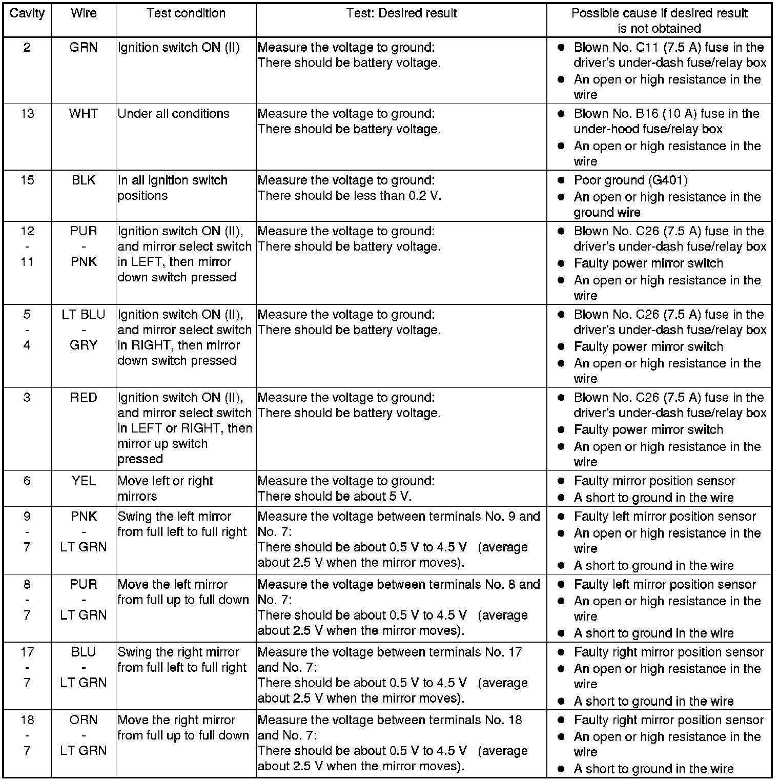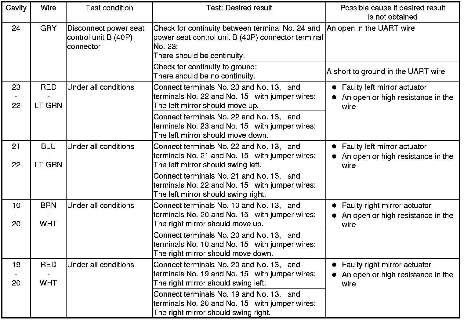 - If all the input tests prove OK, the power mirror control unit must be faulty; replace it.