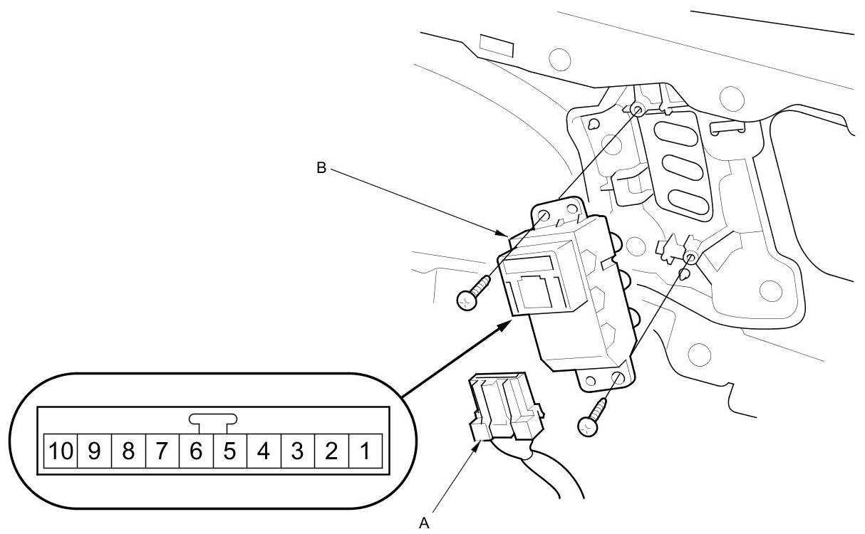 2. Disconnect the 10P connector (A) from the driver's position memory switch (B).