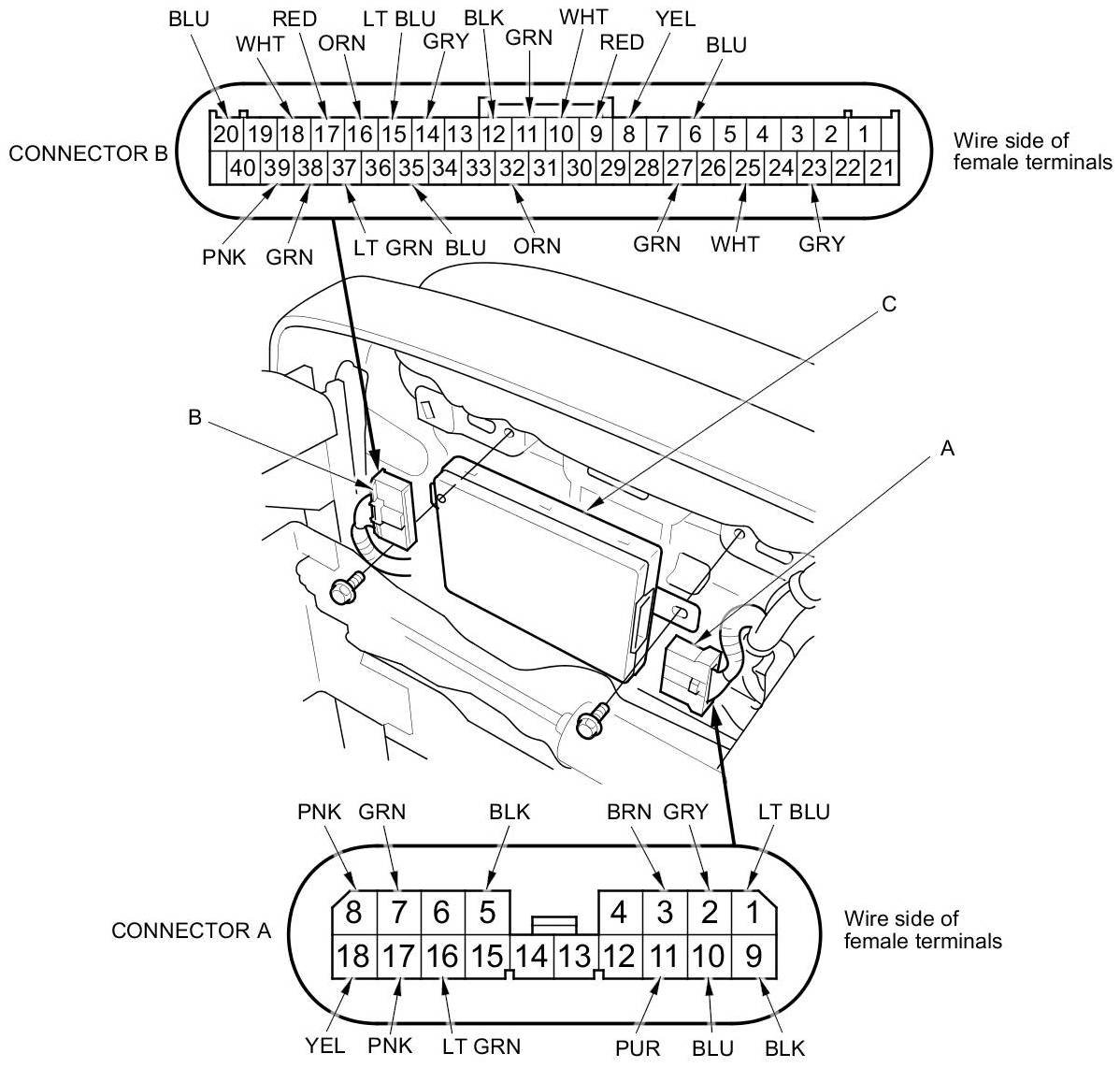 3. Disconnect the 18P connector (A) and 40P connector (B) from the power seat control unit (C).