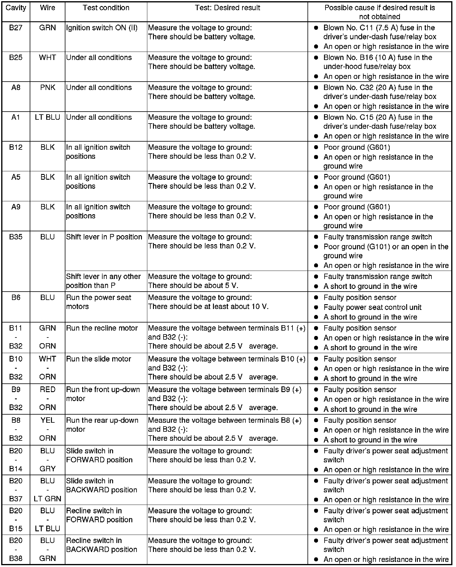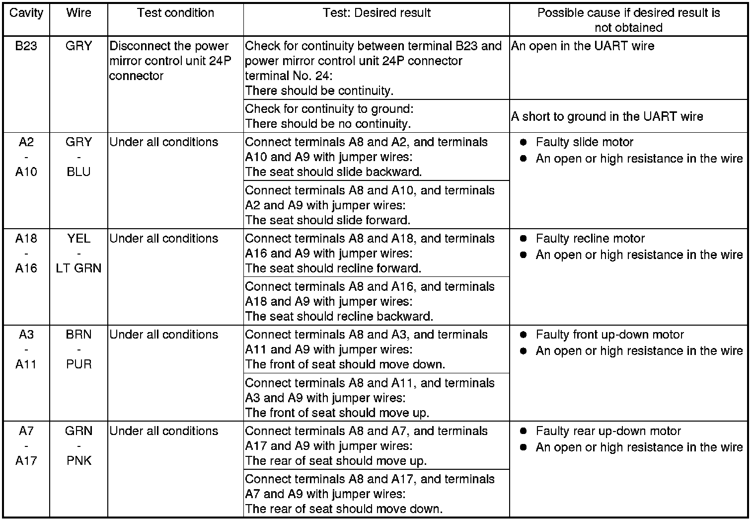 7. Disconnect the connectors from the power seat control unit, and do the following input tests: