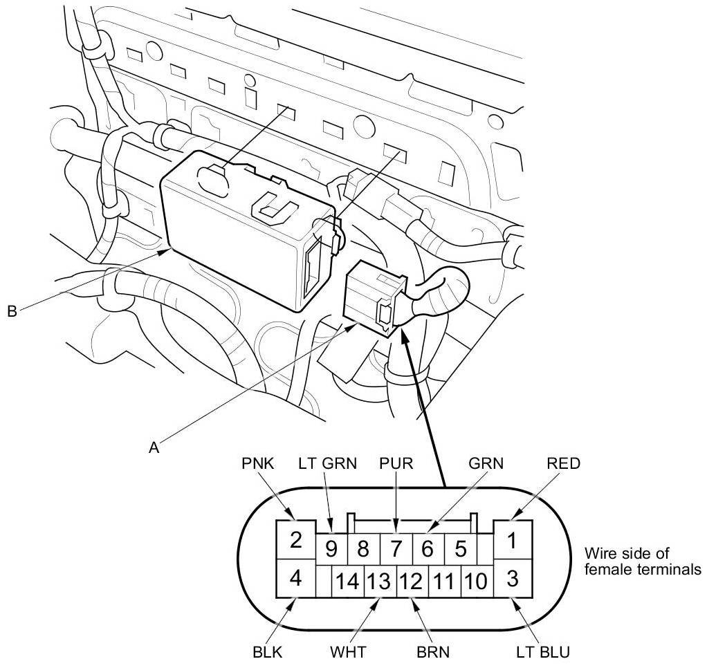 3. Disconnect the 14P connector (A) from the seat heater control unit (B).