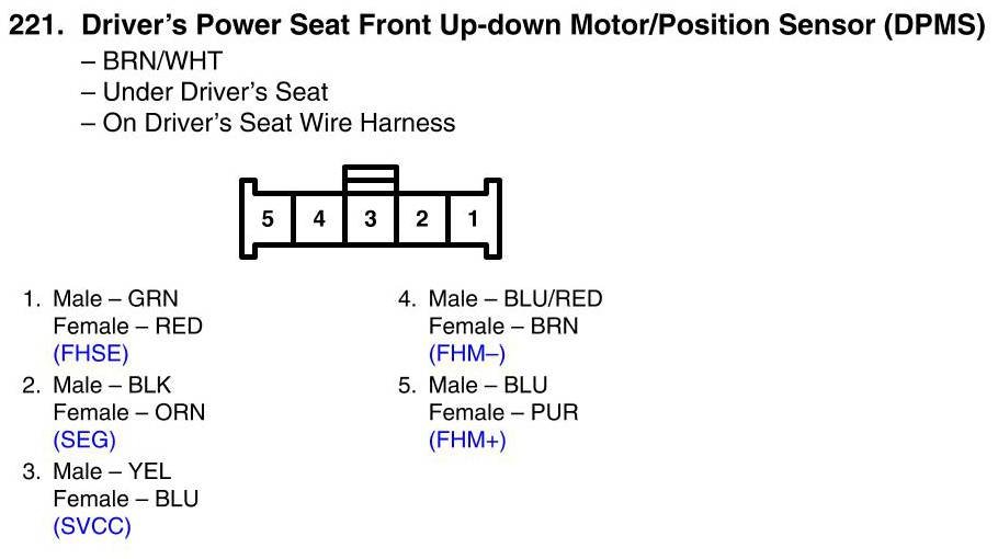 View 221 - Driver's Power Seat Front Up-Down Motor/Position Sensor Connector View (DPMS)