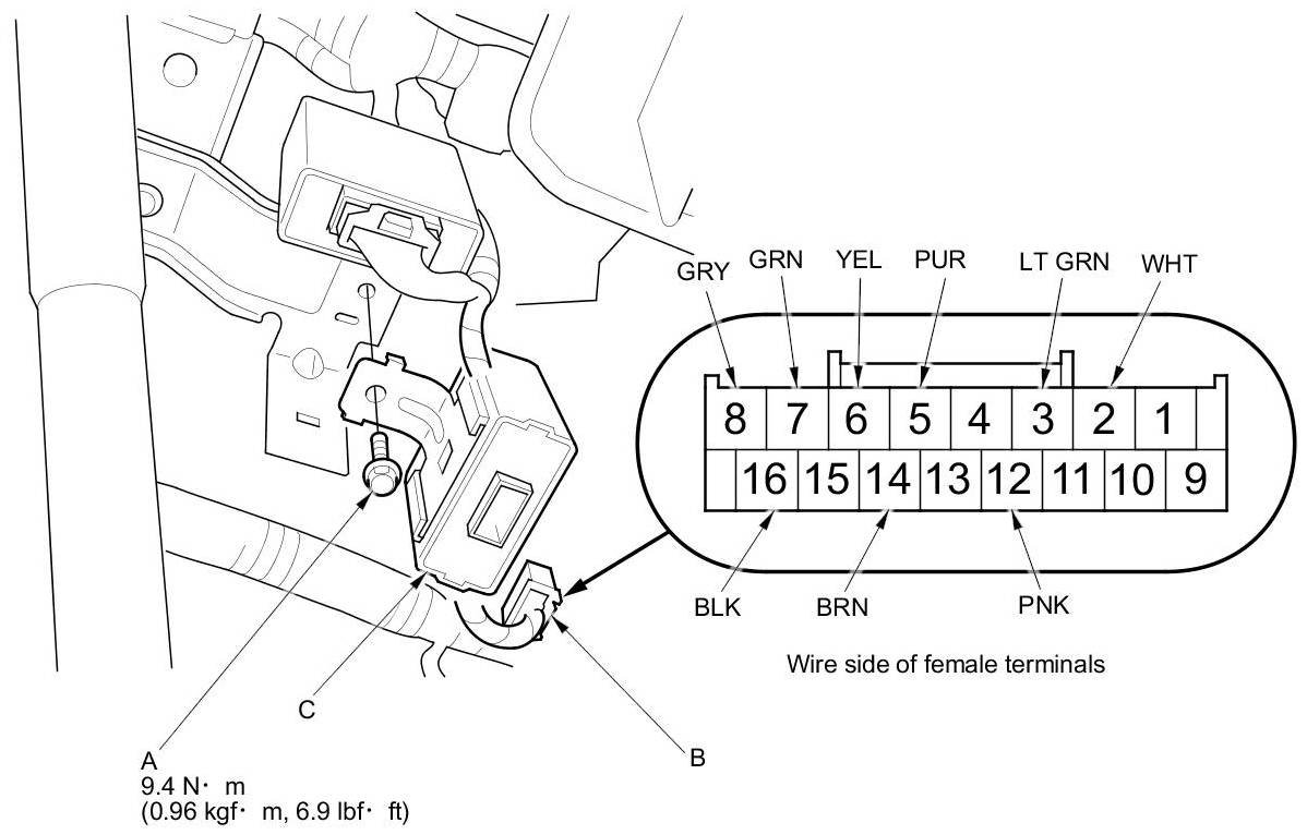 2. Disconnect the 16P connector (B) from the headlight leveling control unit (C).
